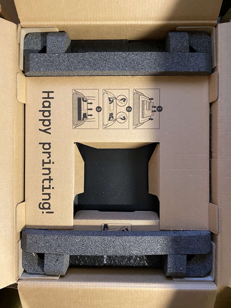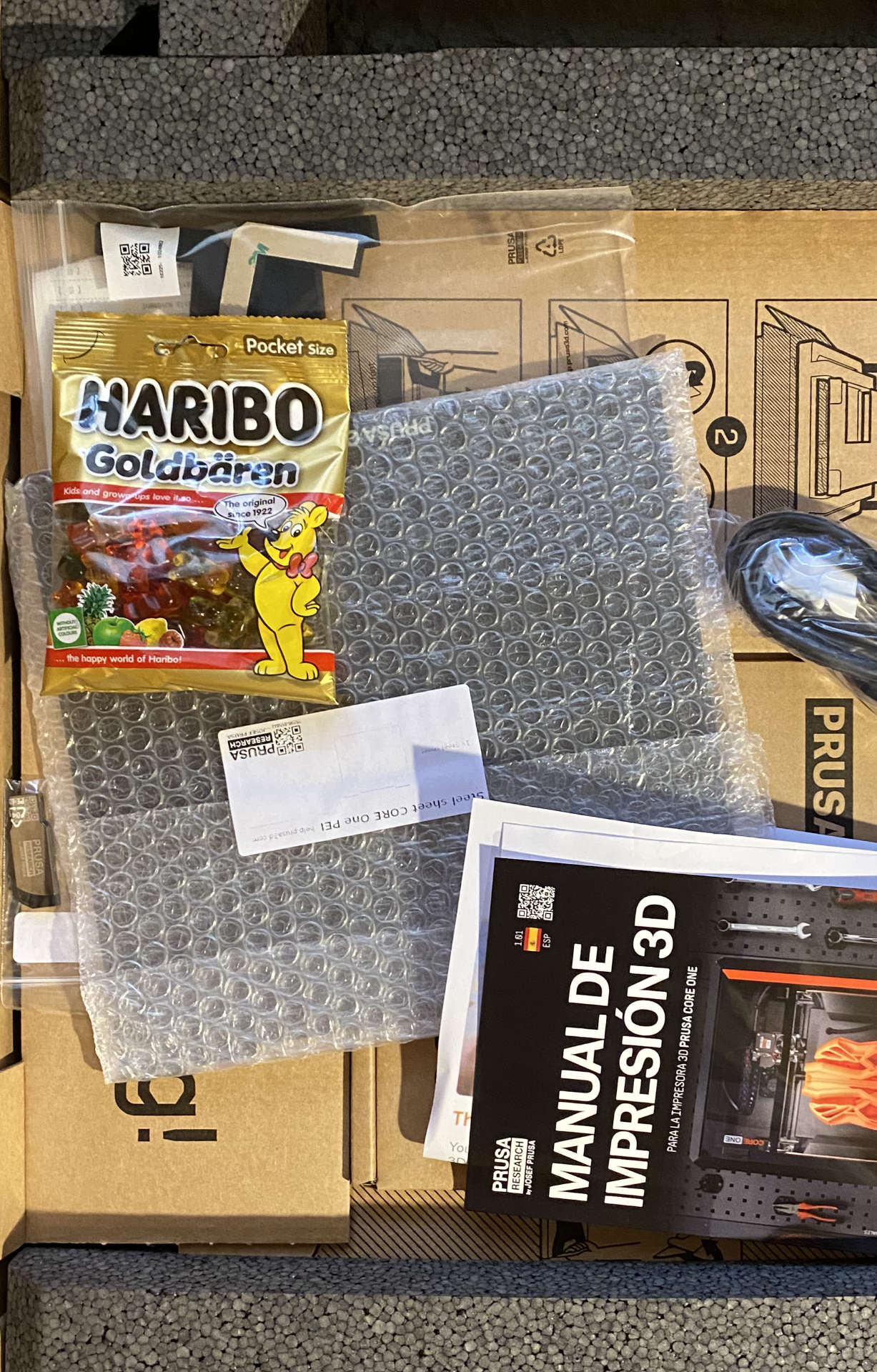 PRUSA no es menos. La caja es aparentemente sencilla pero esconde el mimo por el cuidado de lo que has comprado. Es un buen cartón, tiene unas asas empotradas de plástico que permiten transportar a pulso el quintal que pesa. Una vez abierta, lo primero son las vitaminas, que incluyen unas gominolas Haribo. El sistema pensado para extraer la máquina es ingenioso y práctico.