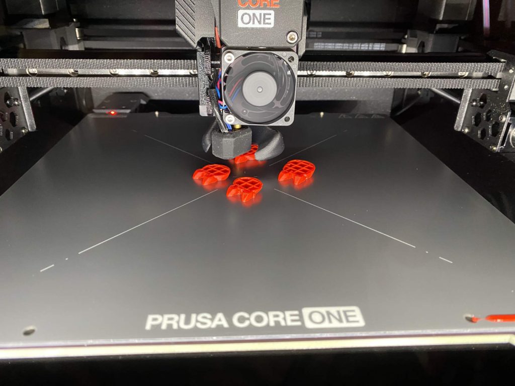 Las seis tarjetas salieron limpias. Cada pieza con su cara inferior en Galaxy Black y su cara superior en Prusa Orange. Todas las piezas unidas a su tarjeta por las pestañas que yo mismo había diseñado.